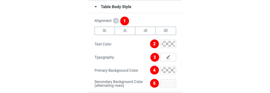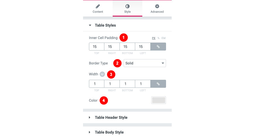 Adjusting the table color and style is relatively easy. In Elementor’s Style tab you can change the heading styles