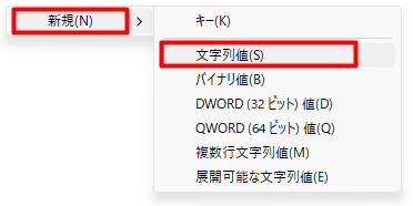 Explorer階層が選択された状態で [新規]-[文字列値]メニューを選択する。
