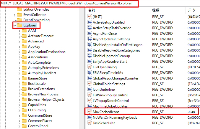 コンピューター\HKEY_LOCAL_MACHINE\SOFTWARE\Microsoft\Windows\CurrentVersion\Explorer