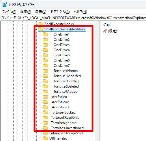 コンピューター\HKEY_LOCAL_MACHINE\SOFTWARE\Microsoft\Windows\CurrentVersion\Explorer\ShellIconOverlayIdentifiers