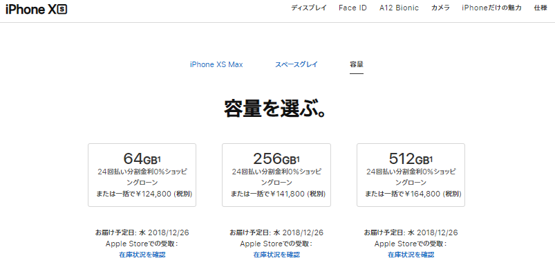 iPhone XS Max はAppleシムフリー版で64GBで12万、512GBで16万。