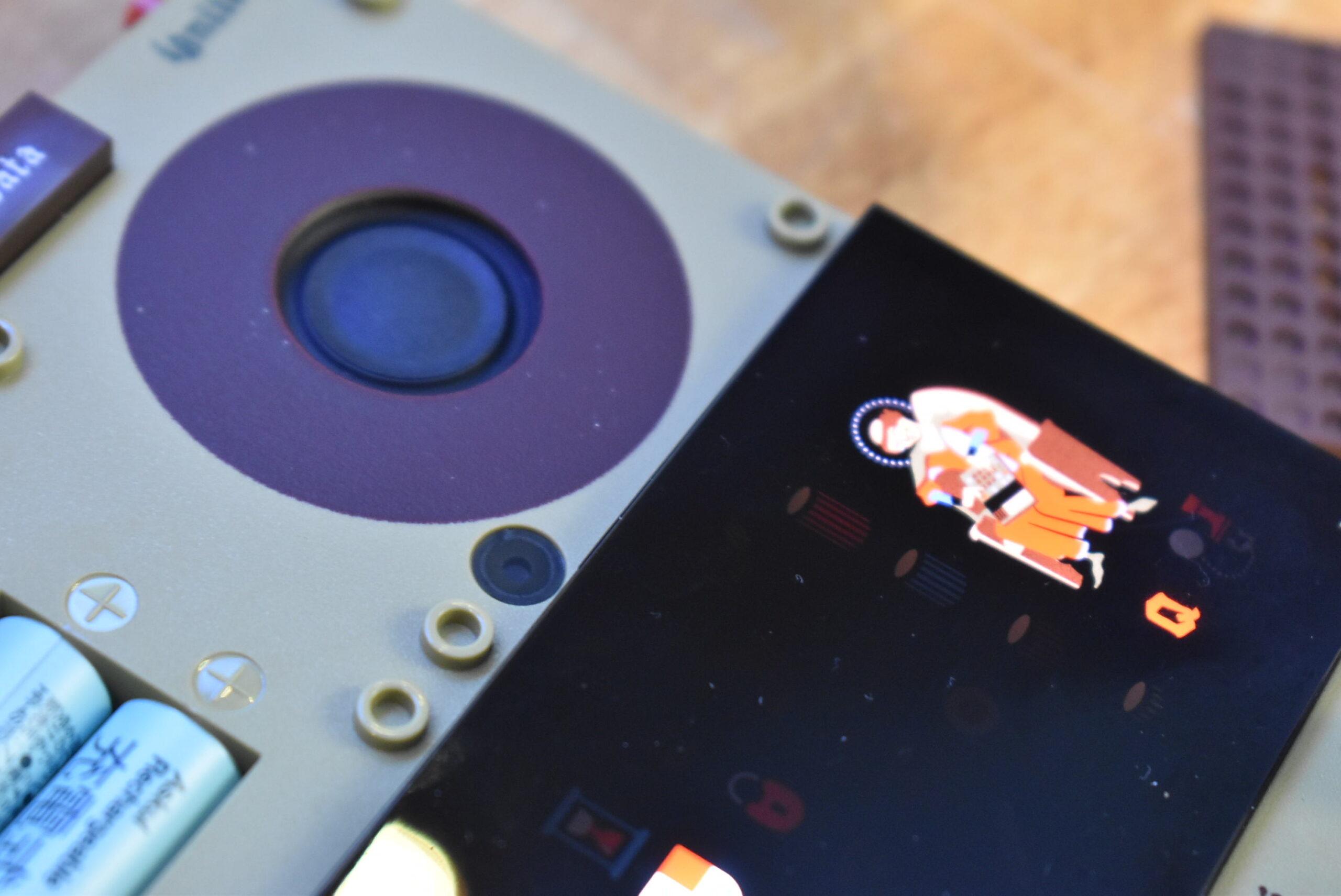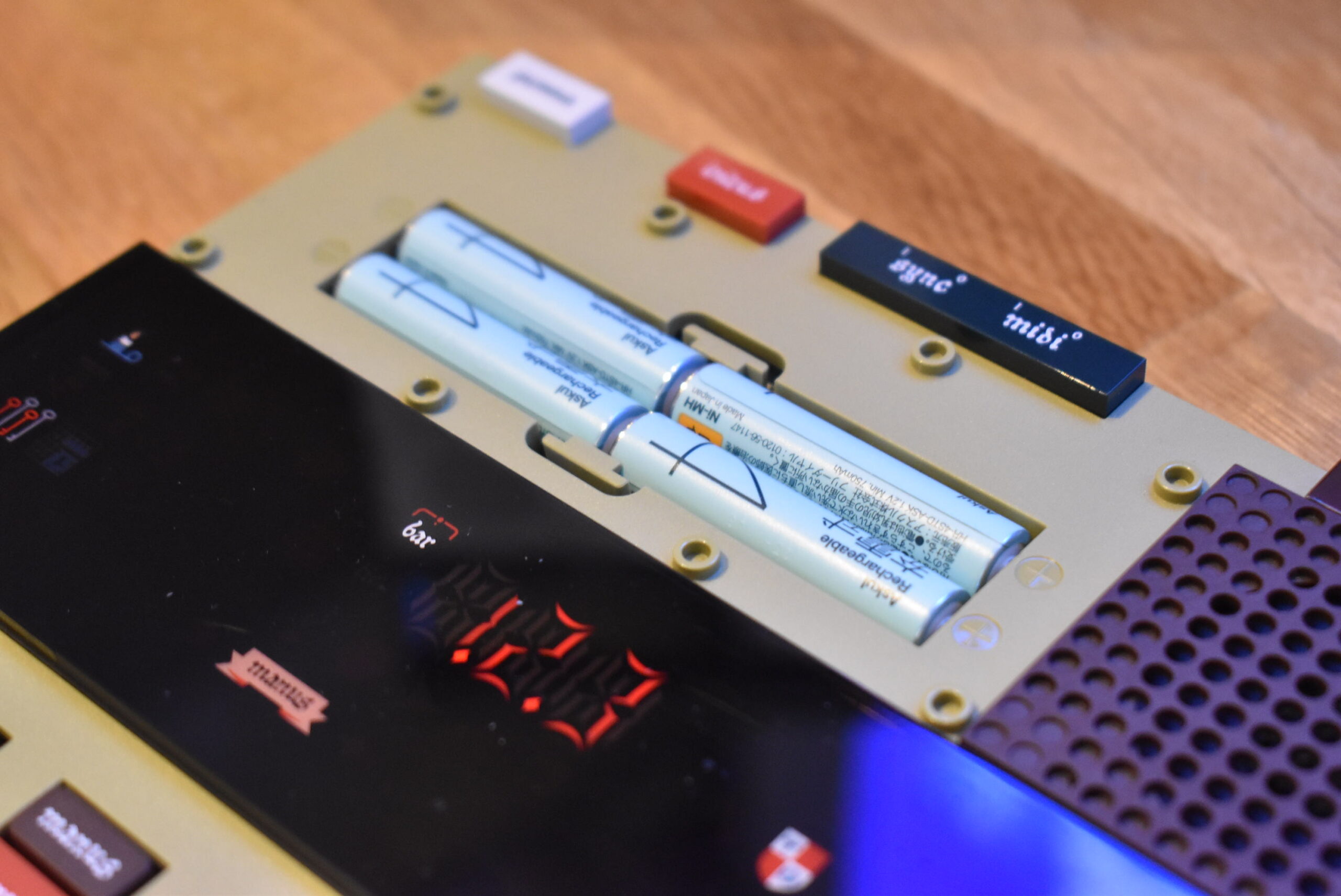 またK.O.IIになかった機能としてアルペジオ機能も追加されています。これは[quantum]ボタン(K.O.IIではTIMINGボタンですが、クォンタイズっぽい名前なのでなんとなく通じそうでもあります)を押しながら複数のテンキーを同時に押すと、その音の間でアルペジオが鳴る形になっています。 ところで、ディスプレイの上にある蓋を取り外すとバッテリーボックスが登場してきます。これを見るとわかる通り単4電池4本で駆動し、これだけで結構な時間使うことが可能です。またスピーカーのメッシュの蓋を外すとスピーカー部も現れるのですが、その左下にはマイクが内蔵されており、これを使ってサンプリングできるようにもなっています。ここでちょと面白いのはこの蓋の取り付け部分がレゴのサイズになっており、レゴとの互換性があるという点。つまり、レゴで組み立てた蓋を乗せるなんてことも可能になるわけです。またサイドにも左右5つずつ穴が開いてますが、これらはヘッドホンを挿すためとか、オーディオ機器と接続するための端子というわけではないんですよ。