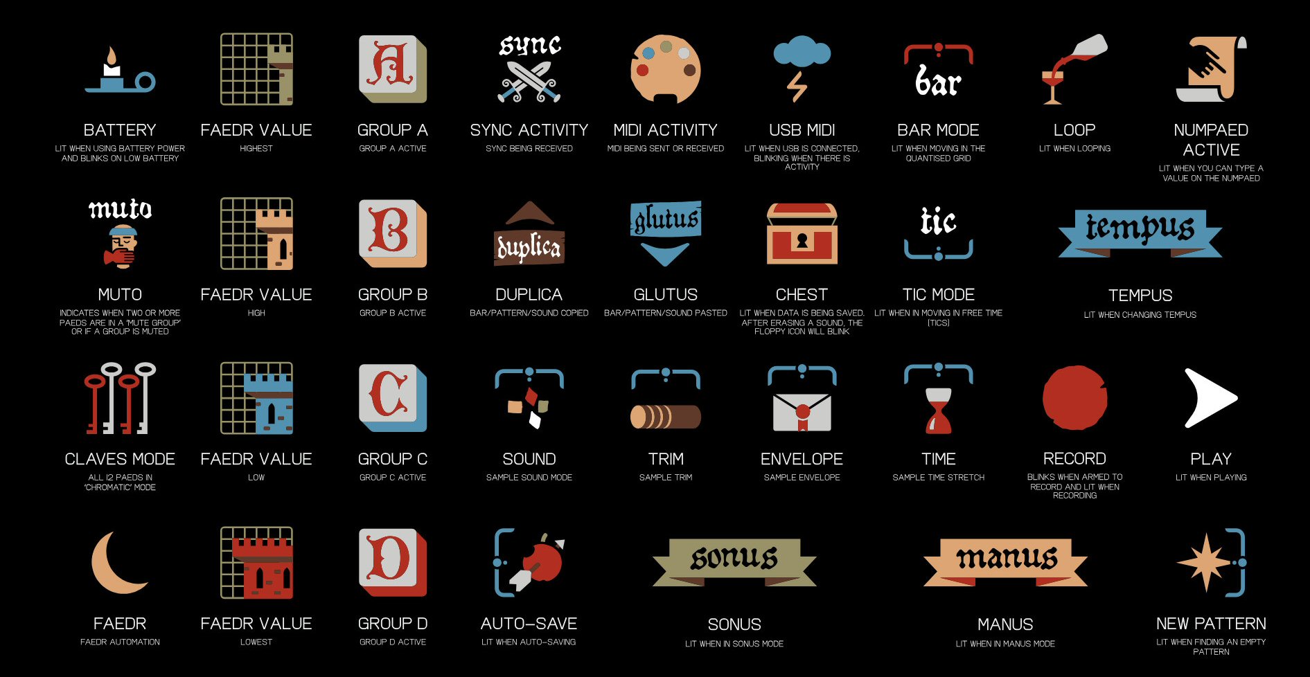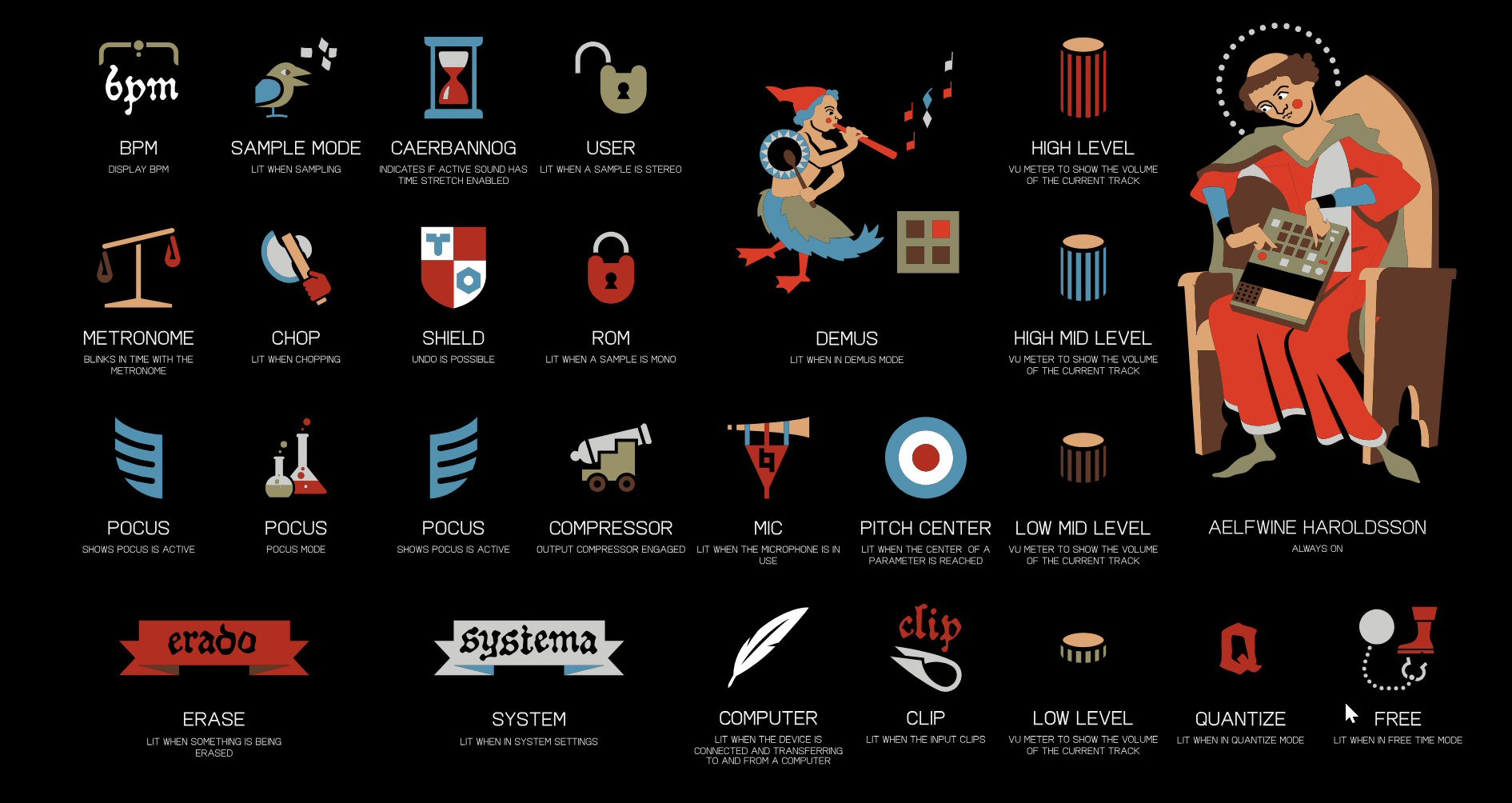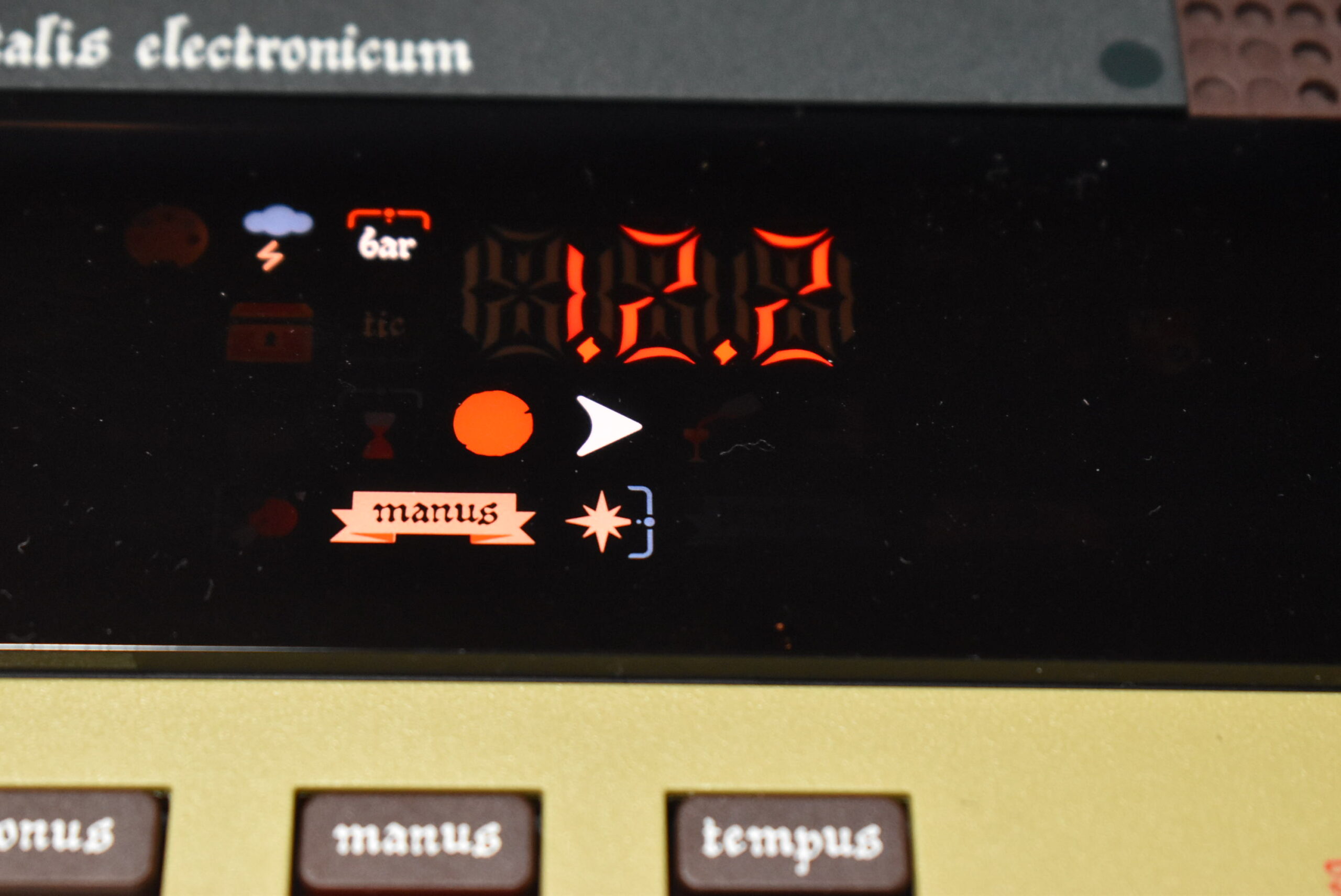 先ほどから、ボタンの意味の解説をしていますが、ラテン語だったり古英語だったりするので、ボタンを見ても何を意味してるのかさっぱり分からない……というのがちょっと難しいところ。まあ、マニュアルもあるし、謎解きのようで面白いといえば面白いけど、使い方に慣れるまで、ちょっと大変かもいれません。ディスプレイ表示もパッと見何のことやらさっぱりわからないのですが、そのアイコンの一覧を見ると、こんな感じですね。