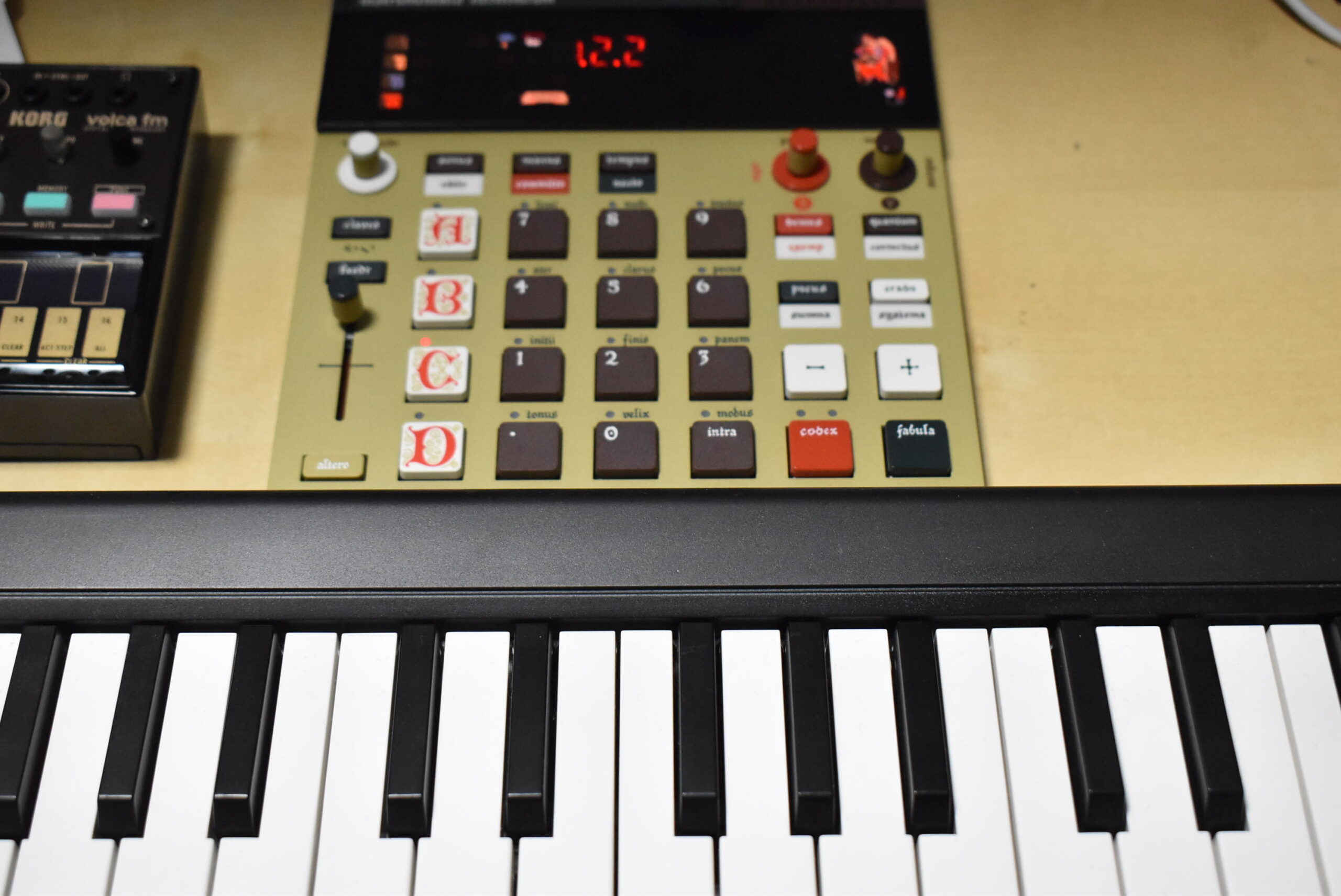 このシーケンスデータの入力方法は大きく分けて3つあります。ひとつは電卓のキーを弾く形でリアルタイムレコーディングしていくという方法。赤い[codex]と書かれたボタン(録音ボタンですね)を押しながら、紺色の[fabula]と書かれたボタン(再生ボタンですね)を押すと、metrum(メトロノームのことですね)が鳴りだすので、電卓のキーを弾いていけばいいのです。あらかじめそれが1小節なのか2小節なのか、4小節なのか……といった設定をしていくことで、その小節分をループする形でレコーディングしていくことができます。ちなみに、まさに電卓という感じの叩き心地ではあるけれど、ちゃんとベロシティ(強弱の2段階)は感知するし、押し込めばアフタプレッシャーも検知するなど、かなりよくできたシステムに仕上がっています。またこのリアルタイムレコーディングの際には、自動的にクォンタイズもかけた形で録音されるため(クォンタイズのかからないフリーモードもある)、適当に入力してもいい感じで入って行ってくれます。
