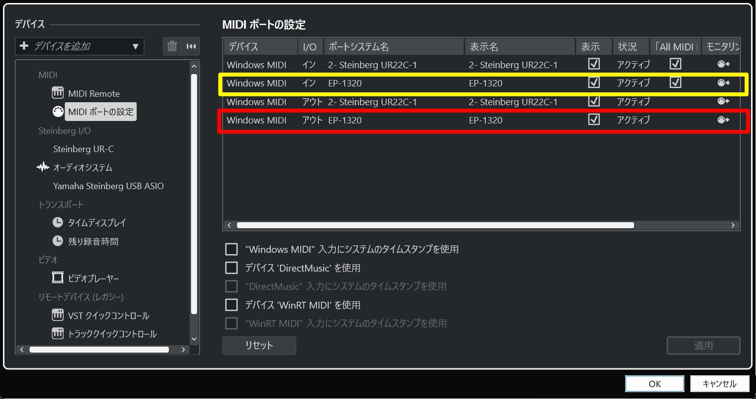 一方でDAWを起動するとMIDIの入出力ポートとしてmedieval=EP-1320が見えます。このときMIDIトラックからMIDI信号を出せば、medievalを鳴らすことが可能です。逆にmedieval側のMIDIの出力設定をONにしてMIDIチャンネルを設定すると、テンキーで演奏したものをDAW側にレコーディングすることができるし、DAW側で音源を立ち上げればそれを鳴らすことも可能になります。つまりUSBを通じてMIDIの入出力ができるようになっているのです。先ほどのWebアプリもMIDIを使っているんですね。ただしオーディオ信号の入出力はできません。