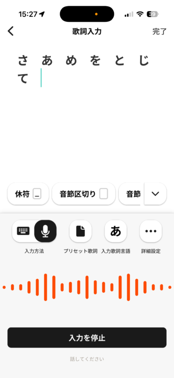 もちろんそうした歌詞入力も可能になっています。この入力はCT-S1000V本体で行うのではなく、iPhoneやAndroidのLyric Creatorというアプリを用いて行うのです。日本語か英語かを選択した上で、日本語であればひらがなで1つ1つ入力していくことができます。さらに音声入力モードを用いればソフトウェアキーボードを使うことなく、直接しゃべって入力できるし、結構高精度な認識率で入力できるので、便利に使うことができます。