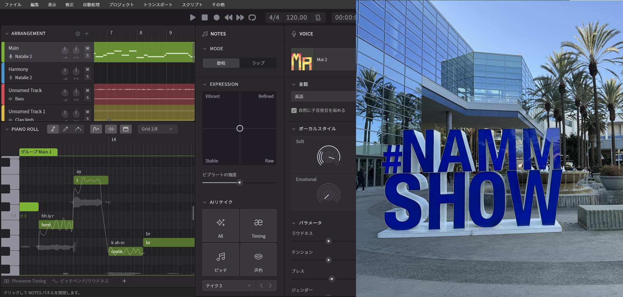 最近のAI歌声合成とはちょっと雰囲気が違い、ボコーダーっぽいというか機械っぽい歌声であるのが特徴でもありますが、プリセットでさまざまな歌声が用意されているので切り替えることでかなり違った雰囲気になります。さらに男性的な歌声か女性的な歌声か、若い声か年齢のいった声か、ビブラートの掛かり具合がどのくらいかなど、自由に調整して歌声を作っていくことができるのも楽しいところです。