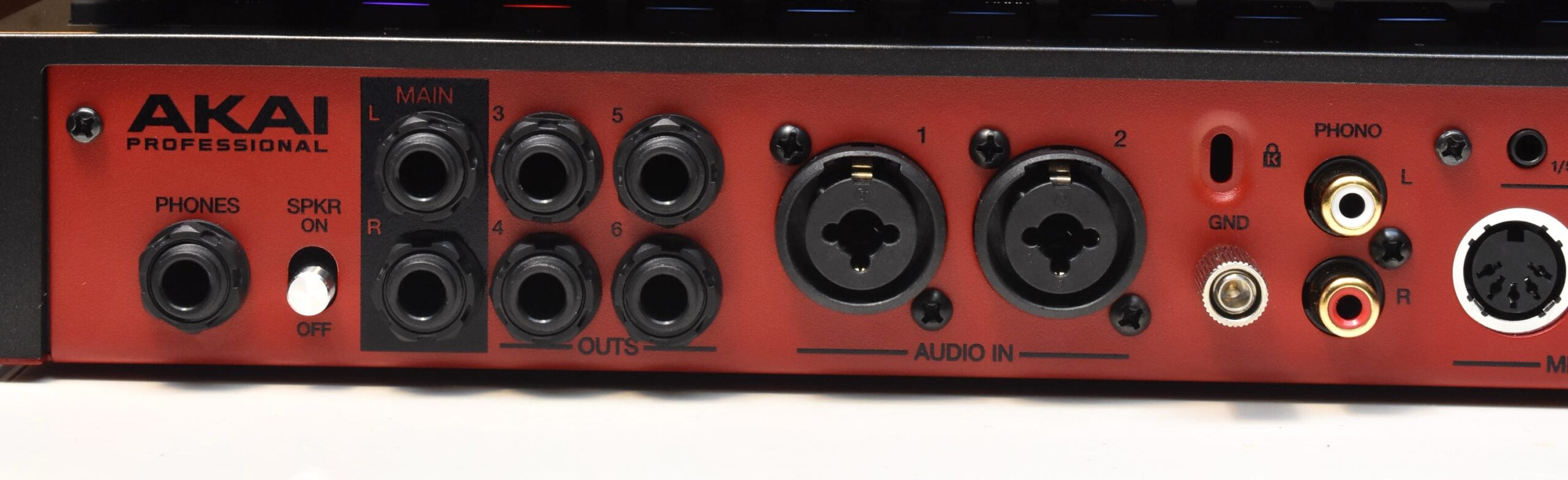 MPC Live IIIでは、リアパネルもアップデートされ、これまでフォン端子だった入力がファンタム電源供給可能なマイクプリアンプを搭載したXLR/TRSコンボジャック2系統になりました。後述しますが、本体に搭載されたマイク以外にも、ダイナミックマイクやコンデンサマイクの接続を簡単に行えるようになりました。もちろん、これまでと同様にライン入力も可能です。その隣には、前モデルから引き続きターンテーブルを直接接続できるRCA端子、出力はメインアウトに加え、4系統のTRSライン出力の合計6つの出力を備えています。