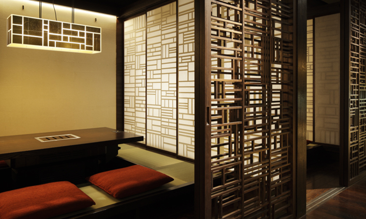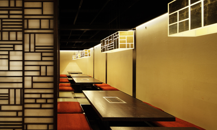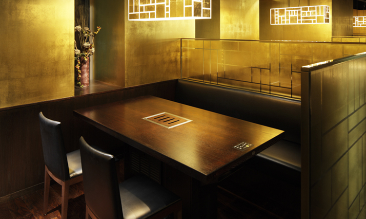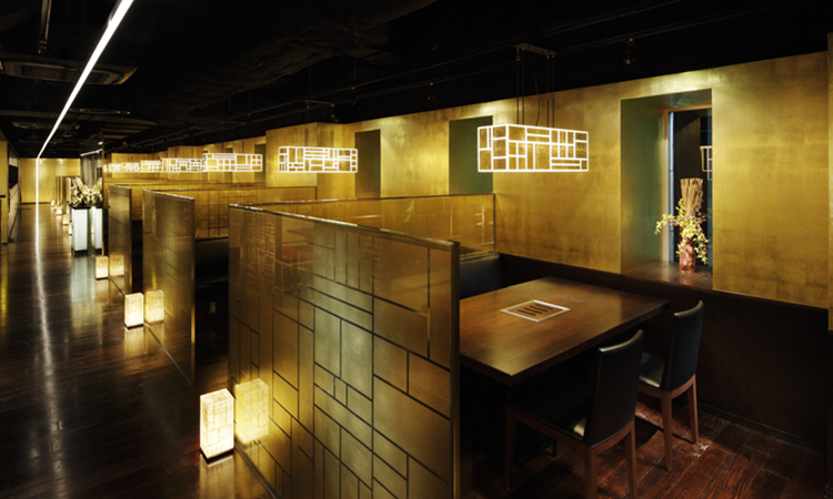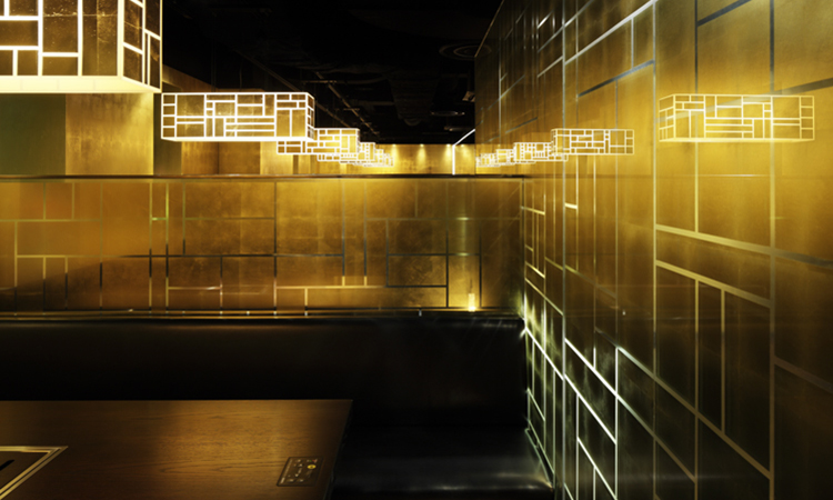 京町屋を思わせる奥行きが深い店内は、韓国の伝統手芸をモチーフに、日本では古くから至上のものを表す色彩、金色と木材を用いて格子模様を作り、ゴージャスでありながらシック。