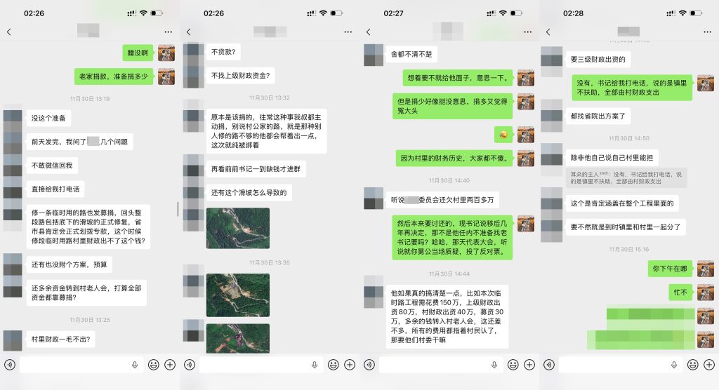 期间,发生一件令我不太愉快的事,我被逼捐了,村书记给我打电话,说辞是那种道德绑架式的,简单说来就是你必须出钱,你不出钱就是有愧于家乡。这次我不想参与的原因如上聊天记录所述,如我所说,捐少没意思,捐多又觉得自己冤大头。就不细述了,最终,我还是冤大头。