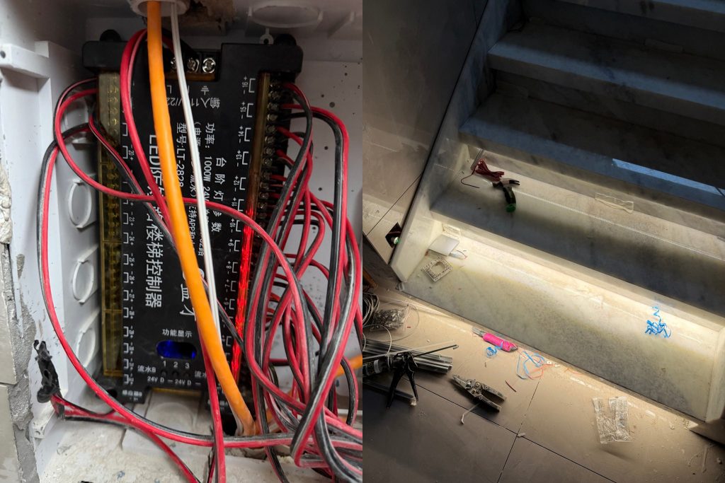 媳妇儿要的网红楼梯踏步灯,流水跑马灯带,正在紧张安装中,4套系统,安装还得三四天,之前装楼梯石材的时候,预埋了灯线,但是因为是手动铺设的楼梯,灯带预留的槽位有些大于1.2cm有些小于1.2cm,小于1.2cm的灯槽就无法卡进去,正在想法解决这个问题,实在不行就换成不带铝槽的硅胶COB灯带。