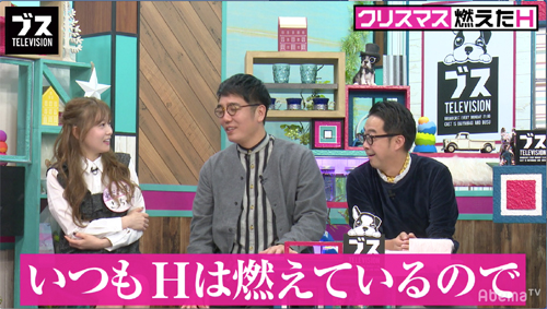 今回は「ブスにも平成最後のクリスマス・イヴがやって来たSP」と題して、自称“ブス”メンバーの皆さんは、思い思いのクリスマスらしい衣装で登場。そんな中、始まったテーマ「クリスマスに燃えたH」では、クリスマスにどんな熱いHをしたのか出演者に聞いた。