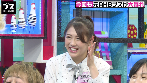オープニングトークでは、前回に引き続き登場した元AKB48の西野未姫が「2回目だと居心地の良さを感じてきた。モニターを観る度に、周りがブス過ぎて自分の可愛さが実感できる。だから“私って、こんなに可愛かったんだ!”と、(モニターを)観る度に元気が出る」と、可愛さをアピールする発言をするも、自称“ブス”メンバーから「たいして可愛くない」と返され、スタジオに笑いが起こる場面も。