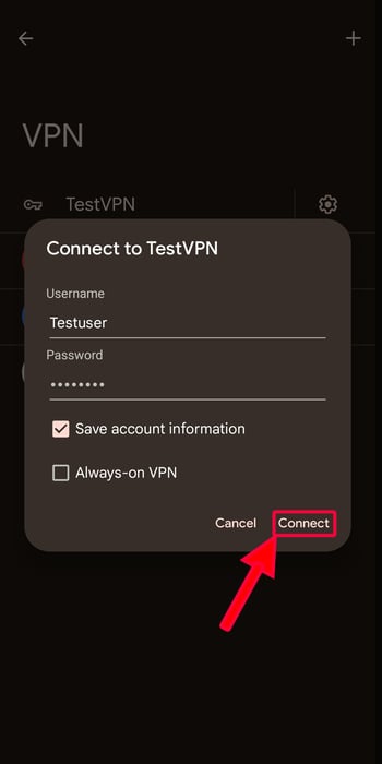 7) Go back to "connections", and select the VPN from the list of available networks, entering the username and password you created.
