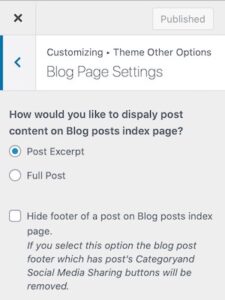 The blog page settings section gives the user an option to display a full post or post excerpt on the blog post listing page. It also gives the user an option to hide the post’s footer (i.e. Categories and social sharing buttons).