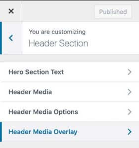 Users can customize the site header with the help of the Header Section. Hero Text section allows the user to add text and button over the header image.The header Media section allows users to set an image or a video of his choice in the site header.The header media options allows users to set the height of the image to the full screen. This section also gives the user a choice to use the header image on all other pages or to remove it from all other pages. The theme comes with three types of Header Overlay options: Default Overlay, Dark Overlay and No Overlay.