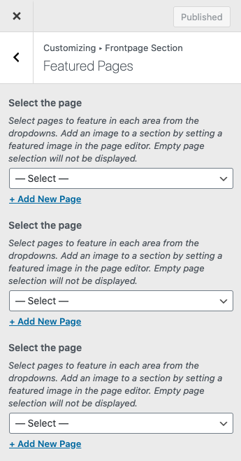 Fronpage Section allows user to display any three pages on the Homepage. If user wants to display pages of her choice on the Homepage, she has to first enable the fronpage section from the General Settings. User can select pages to feature in each area from the dropdowns. To add an image to a section, set a featured image in the page editor.