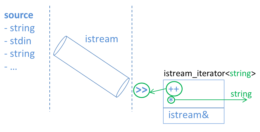 The causes of two of above drawbacks lie at the same place: the operator>> called by the istream_iterator that draws a string from the stream. This operator>> turns out to do a lot of things: stopping at the next space (which is what we wanted initially but cannot be customized), doing some formatting, reading and setting some flags, constructing objects, etc. And most of this we don’t need here.