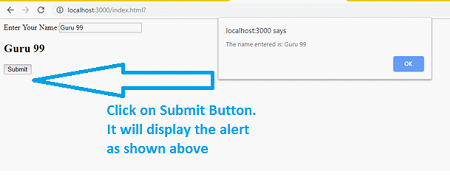 لقد استخدمنا الأحداث عند_التغيير و عند _ النقر في مربع النص والزر. عندما يدخل المستخدم داخل مربع النص، عند_التغيير يتم استدعاء الحدث، ويتم تحديث حقل الاسم داخل حالة كائن الحالة كما هو موضح أدناه: