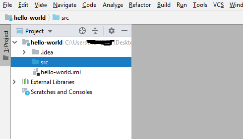 Pour le moment, le projet est vide et ne contient qu'un dossier .idea et un fichier hello-world.iml générés par l'EDI. Notre point d’intérêt est le dossier src. Src est l'endroit où nous stockons le code source de notre projet. C'est là que nous allons créer notre premier fichier Scala.