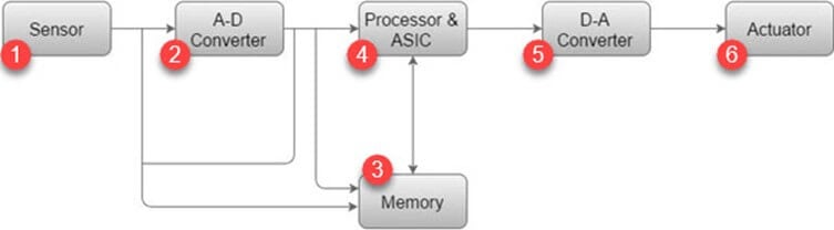 - ArchiA beágyazott rendszer szerkezete a következőket tartalmazza: érzékelő, AD konverter, memória, processzor és ASIC, DA konverter és működtető.
