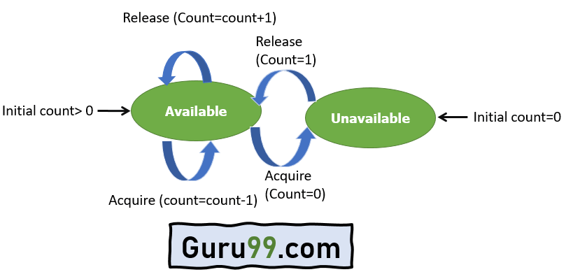 Ez a fajta Semaphore számlálót használ, amely számos alkalommal segíti a feladat megszerzését vagy felszabadítását. Ha a kezdeti szám = 0, akkor a számláló szemafort nem elérhető állapotban kell létrehozni.