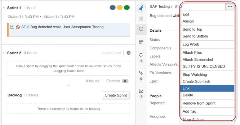 Ada fungsi lain yang berguna adalah JIRA Link, Penautan masalah memungkinkan Anda membuat hubungan antara dua masalah yang ada di server JIRA yang sama atau berbeda. Seperti yang ditunjukkan pada tangkapan layar, kami telah menghubungkan masalah saat ini, “Menu Drop down ST-6 tidak berfungsi,” dengan masalah lain, “GUI ST-4 tidak responsif- fungsi GUI tes ulang”.