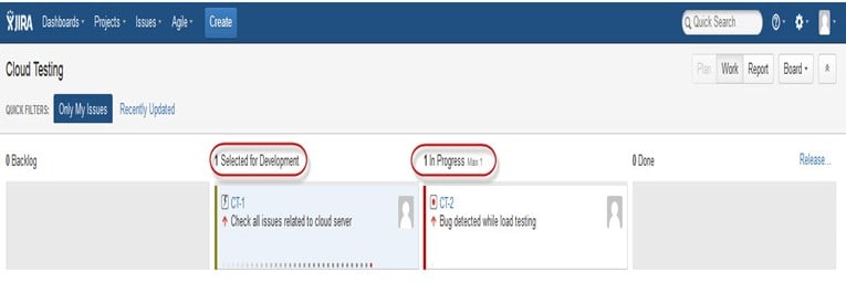 Di sini kami telah membuat masalah "Bug terdeteksi saat pengujian beban" dan “Periksa masalah yang terkait dengan server cloud” di Papan Kanban seperti yang ditunjukkan pada gambar di bawah, ini juga menunjukkan statusnya seperti yang disorot dengan warna merah.