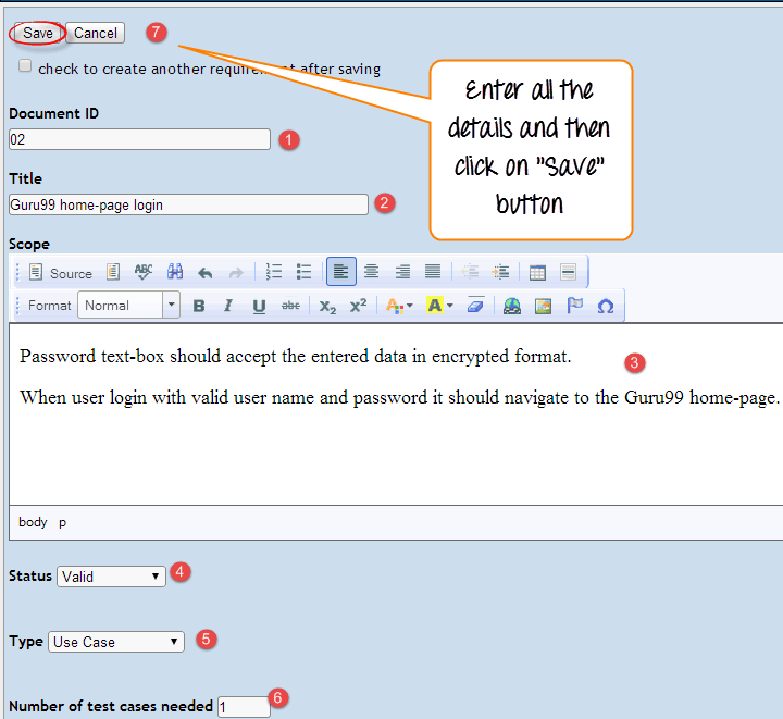 Stap 5: Nadat u de gegevens hebt ingevoerd, klikt u op de knop "create" om de gegevens op te slaan. De testcase voor Guru99 is succesvol aangemaakt