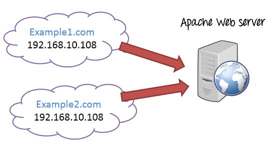 NameVirtualHost *:80 <VirtualHost 192.168.0.108:80> ServerAdmin [email protected] DocumentRoot /var/www/html/example1.com ServerName www.example1.com </VirtualHost> <VirtualHost 192.168.0.108:80> ServerAdmin [email protected] DocumentRoot /var/www/html/example2.com ServerName www.example2.com </VirtualHost>