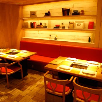 鮮やかな赤が印象的なおしゃれな店内はテーブル席や個室も完備。すべての席に無煙ロースターが設置されており、匂いや煙を気にせず、焼肉を楽しむことができます。