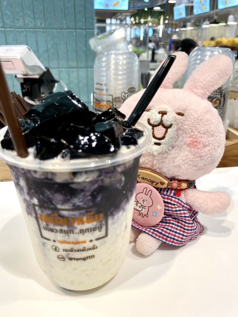 飲み物を入れるカップに氷、牛乳、シロップ、仙草ゼリー?がトッピングされたものです。