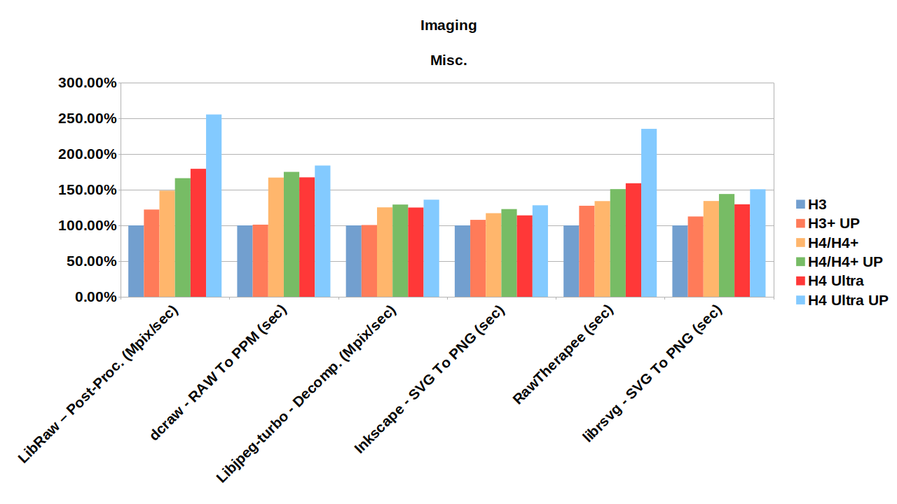 Finally, although it is more expensive, we have also designed the H4 Ultra model, which can take advantage of powerful performance with twice the number of CPU cores (from 4 to 8) and more GPU execution units. Thanks to its many cores and fast clocks, the H4 Ultra model shows computing performance that can be twice as high as the H4 and H4+ models, based on multithreaded computing benchmarking results.