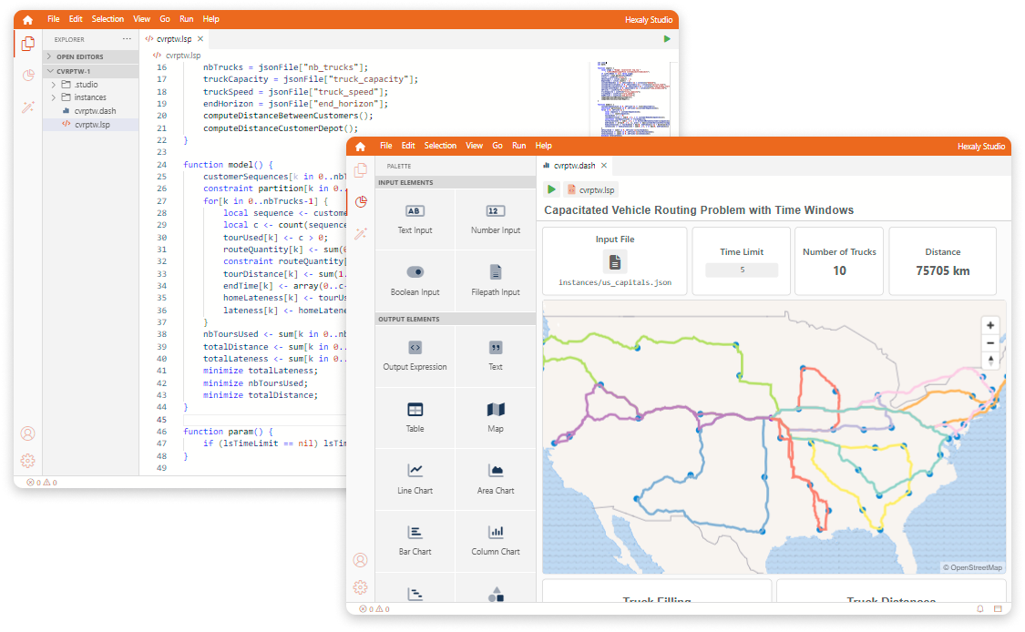 Hexaly Studio provides developers with the perfect low-code SaaS platform for developing, debugging, and running optimization applications written with Hexaly Modeler.