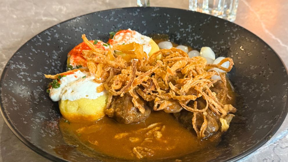 付け合わせのドゥドゥレは主にハンガリー西部の郷土料理で、じゃがいもと小麦粉を混ぜたダンプリグのようなものです。