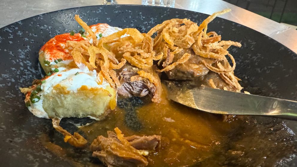 フライドオニオンの下にはマンガリッツァのホホ肉がたっぷり。
