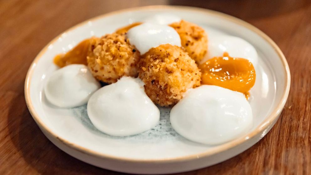 サワークリームとパプリカパウダーでモダンに仕上げられたじゃがいも団子は、ホホ肉とソースとの相性も抜群でした。
