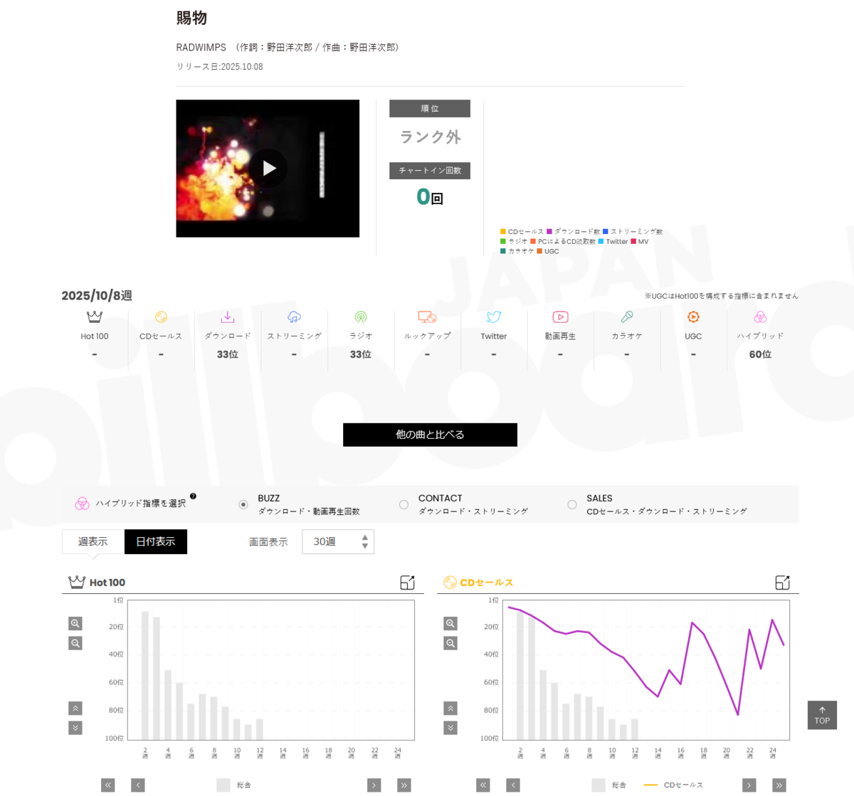 RADWIMPS「賜物」はビルボードジャパンソングチャートにおいて、4月30日公開分で最高9位を記録した一方、トップ40内は翌週(13位)を含む2週、100位以内在籍は11週となっています。ストリーミング指標はビルボードジャパンがリカレントルールを初適用した6月4日公開分にて最高となる68位を記録した一方、加点対象となる300位以内に入ったのは15週という状況であり、ヒットしたと断言するのは難しいかもしれません。