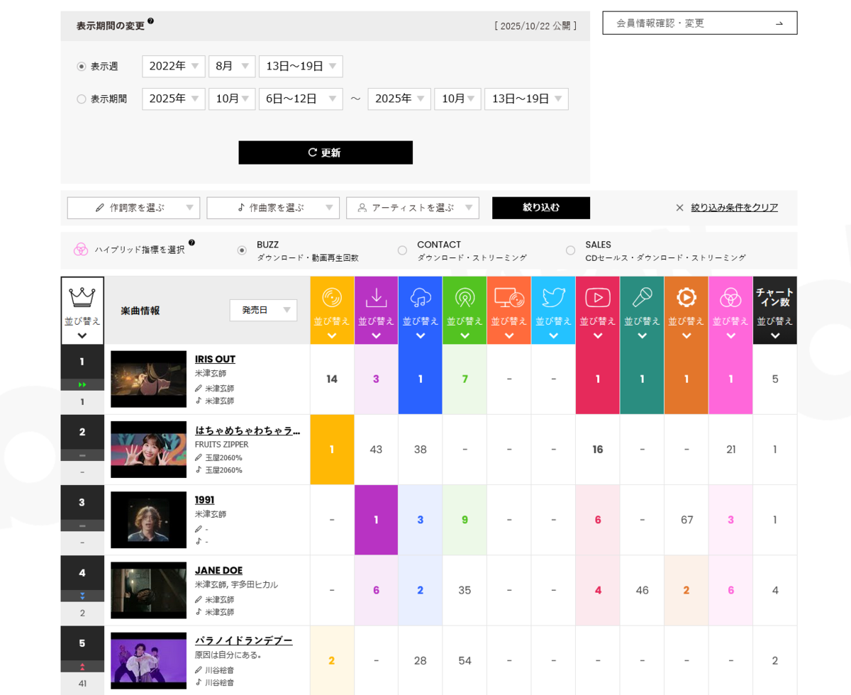 最新10月22日公開分ビルボードジャパンソングチャート(集計期間:10月13~19日)では米津玄師「IRIS OUT」が5連覇を達成。また、米津玄師さんによる作品がトップ5のうち過半数を占めています。