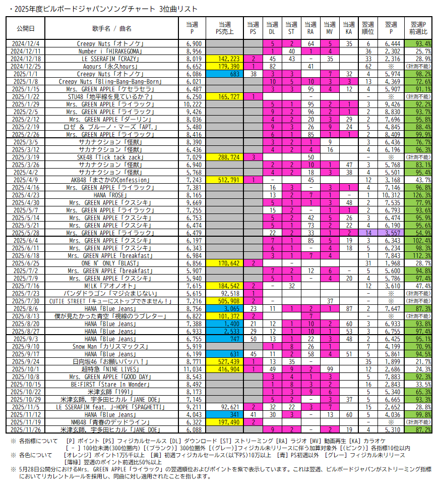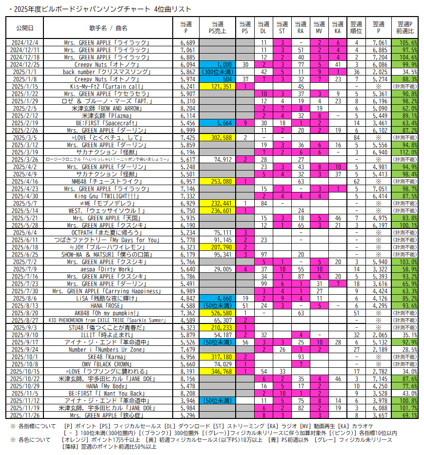 2025年度下半期初週には総合チャートで一定週数以上ランクインする曲やアルバムに対し、Streaming SongsチャートやStreaming Albumsチャート(後者は未公開)のストリーミング指標化時に減算処理を行うリカレントルールを採用。下半期初週にそのリカレントルールが適用されながらも年間首位を獲得したMrs. GREEN APPLE「ライラック」の強さは、やはり納得できるものです。この曲については先日も紹介しています。
