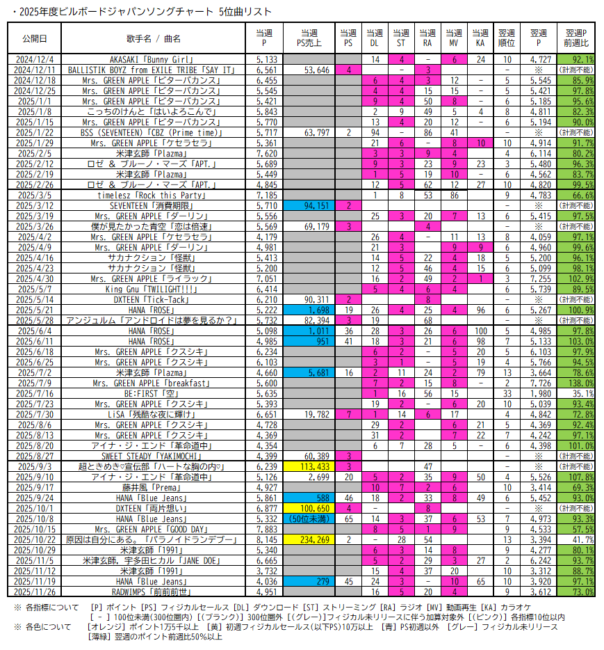 <ビルボードジャパンソングチャート 2025年度週間1~5位ランクイン曲一覧>
