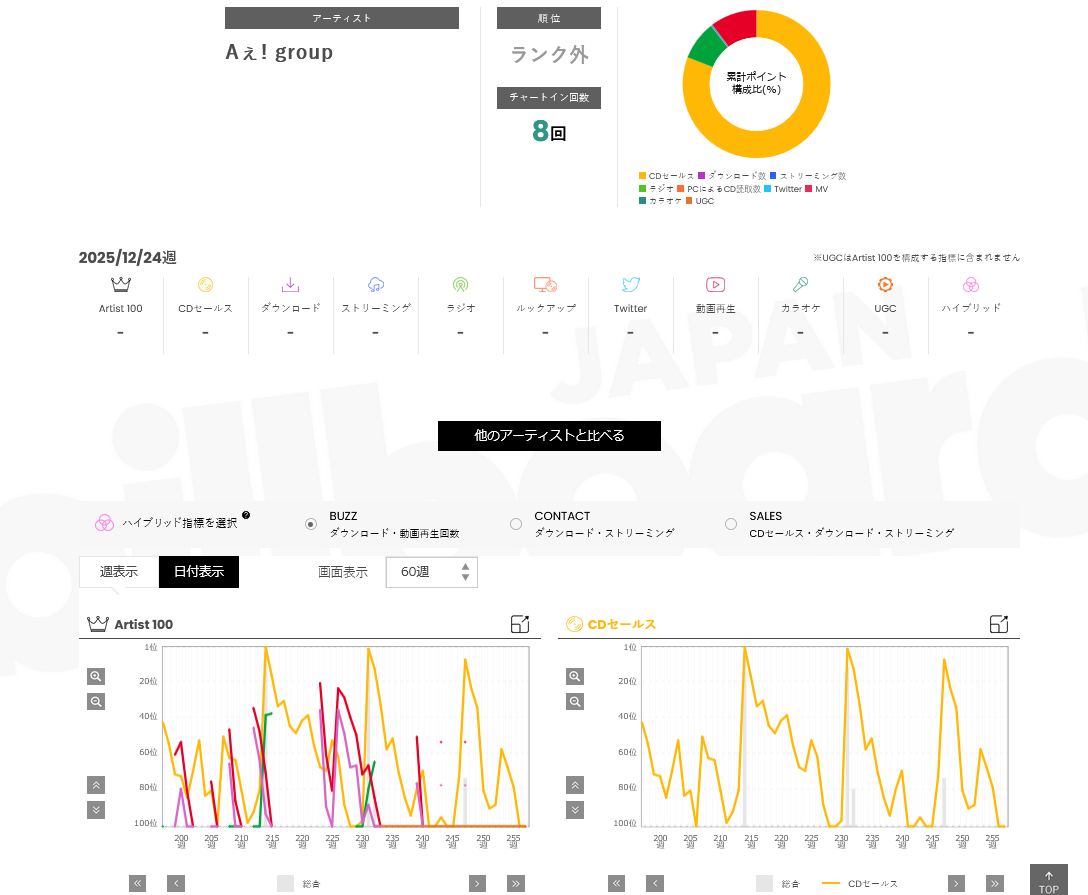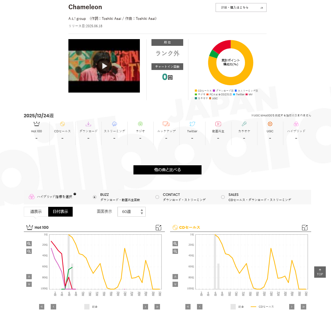 今秋メンバーが脱退していますが、そのアナウンス等のタイミングにて「Chameleon」のフィジカルセールスが伸びています。これは過去2作のシングルやアルバムも同様であり、ソング/アルバムチャートを合算したトップアーティストチャートでもその点が可視化されています。応援する方の多さもここから垣間見られますが、デジタルを解禁していればその思いがチャートにもより大きく反映されたと考えます。
