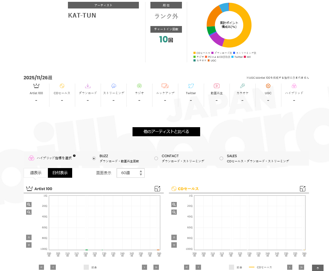 トップアーティストチャートでは構成指標のうち11月19日公開分(11月10日からを集計期間とする週)でラジオが、翌週にはフィジカルセールスが300位以内に入り加点されていますが、ストリーミング指標は300位以内に入っていません。KAT-TUNといえばデビュー曲の「Real Face」をまずはじめに思い出す方は少なくないだろうと考えるに、やはり同曲をはじめとするキャリア全体の解禁は必須だったと考えます。