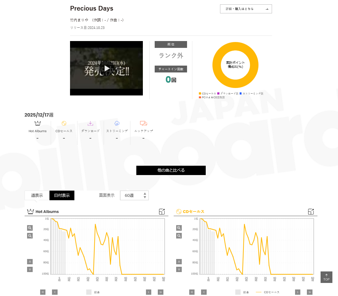 また、竹内まりやさんの最新アルバム『Precious Days』についても、発売から1年以上経過しながら未だデジタル解禁されていません。同作品は新装盤をリリースしたことでフィジカルセールスが再度上昇していますが(新装盤については竹内まりや『Precious Days』新装盤のリリースから、デジタル未解禁について今一度考える(4月2日付)参照) 、その新装盤(デラックスエディション)効果もほぼなくなっています。