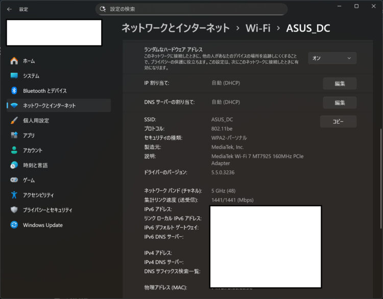 実際にWiFi 7対応デバイス(最新のノートPC)で速度測定を行ったところ、5GHz帯で安定して3Gbps以上の速度を記録しました。