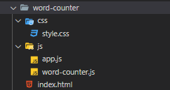 Third, create a style.css file inside the css folder, and two JavaScript files called word-counter.js and app.js inside the js folder.