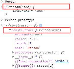 The following shows the Person() function and the anonymous object referenced by the Person.prototype: