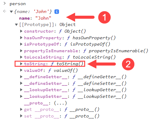 In this example, when we call the toString() method on the person object, the JavaScript engine finds it in the person object.