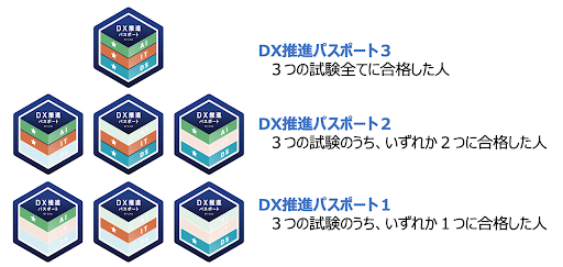 「ITパスポート試験」、「DS検定 リテラシーレベル」、「G検定」の3試験の合格数に応じた3種類のバッジを発行します。3試験のうちいずれか1種類の合格者には「DX推進パスポート1」、いずれか2種類に合格すると「DX推進パスポート2」、3つ全てに合格すると「DX推進パスポート3」のデジタルバッジが発行可能となります。