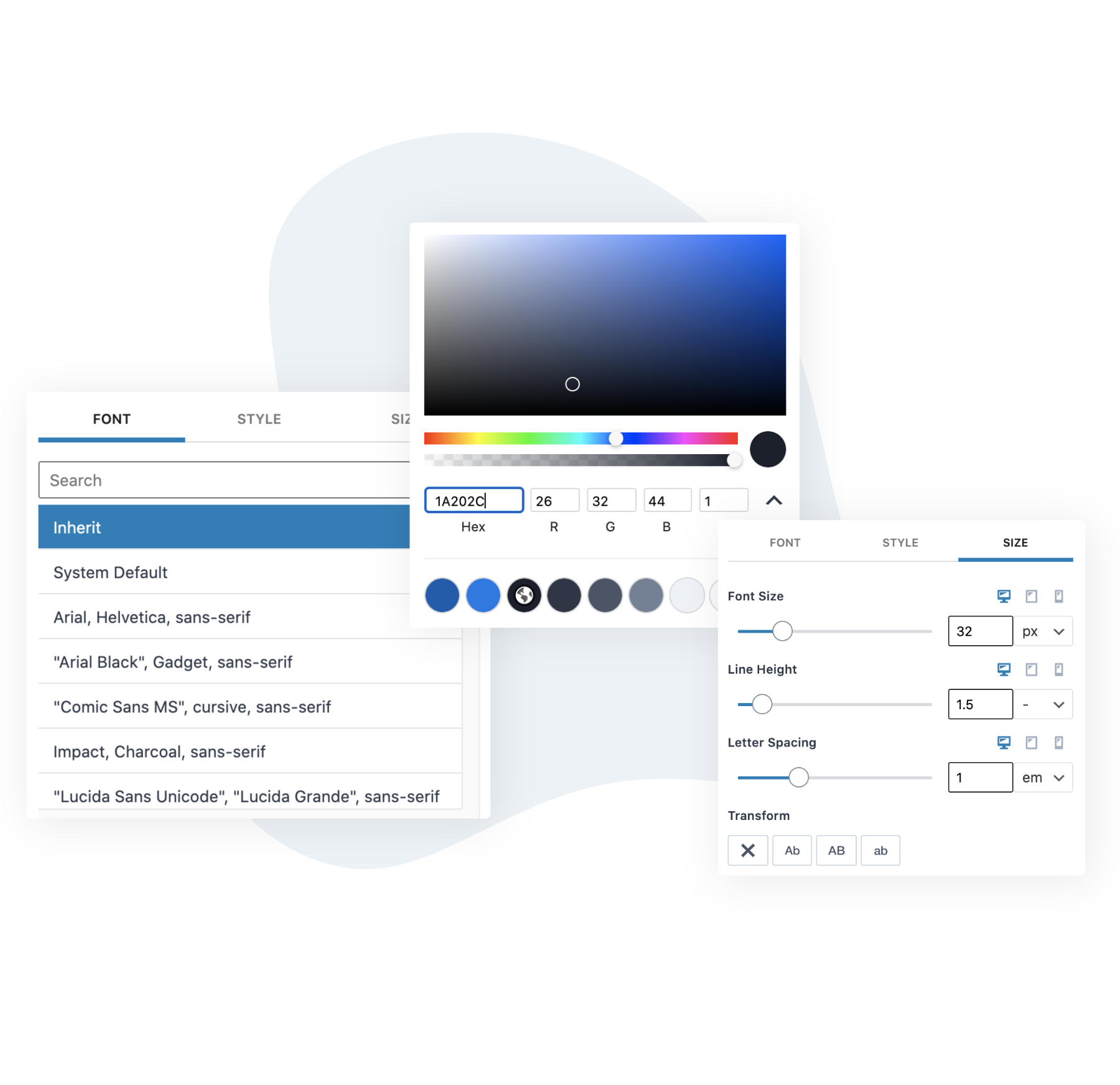 Choose from any google font or a websafe font and define sizes, style, and text transform.